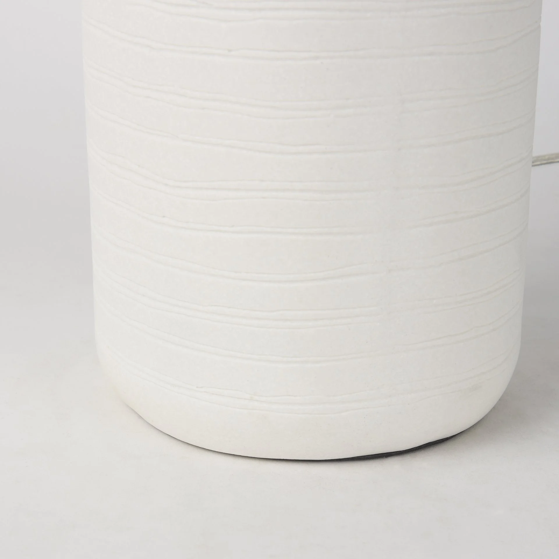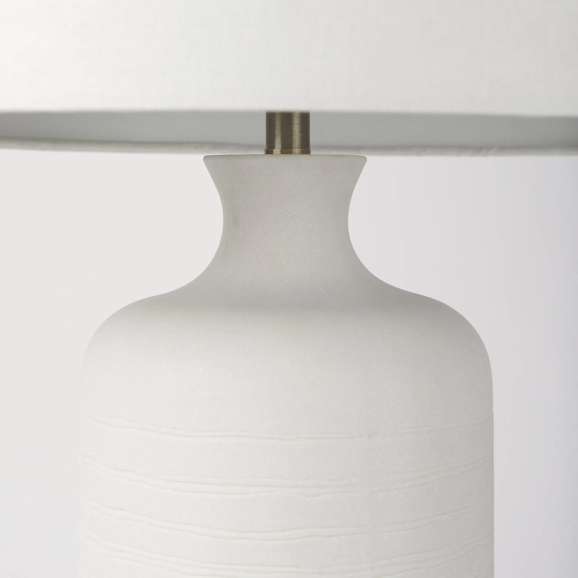 The Melanie is an elegant table lamp featuring a sleek jar-shaped ceramic base atop which is a circular fabric lampshade. Featuring a white toned, round fabric shade mounted atop a sleek, jar-shaped white ceramic base, the Melanie is a table lamp that you'll surely want on your desk or by your bed.