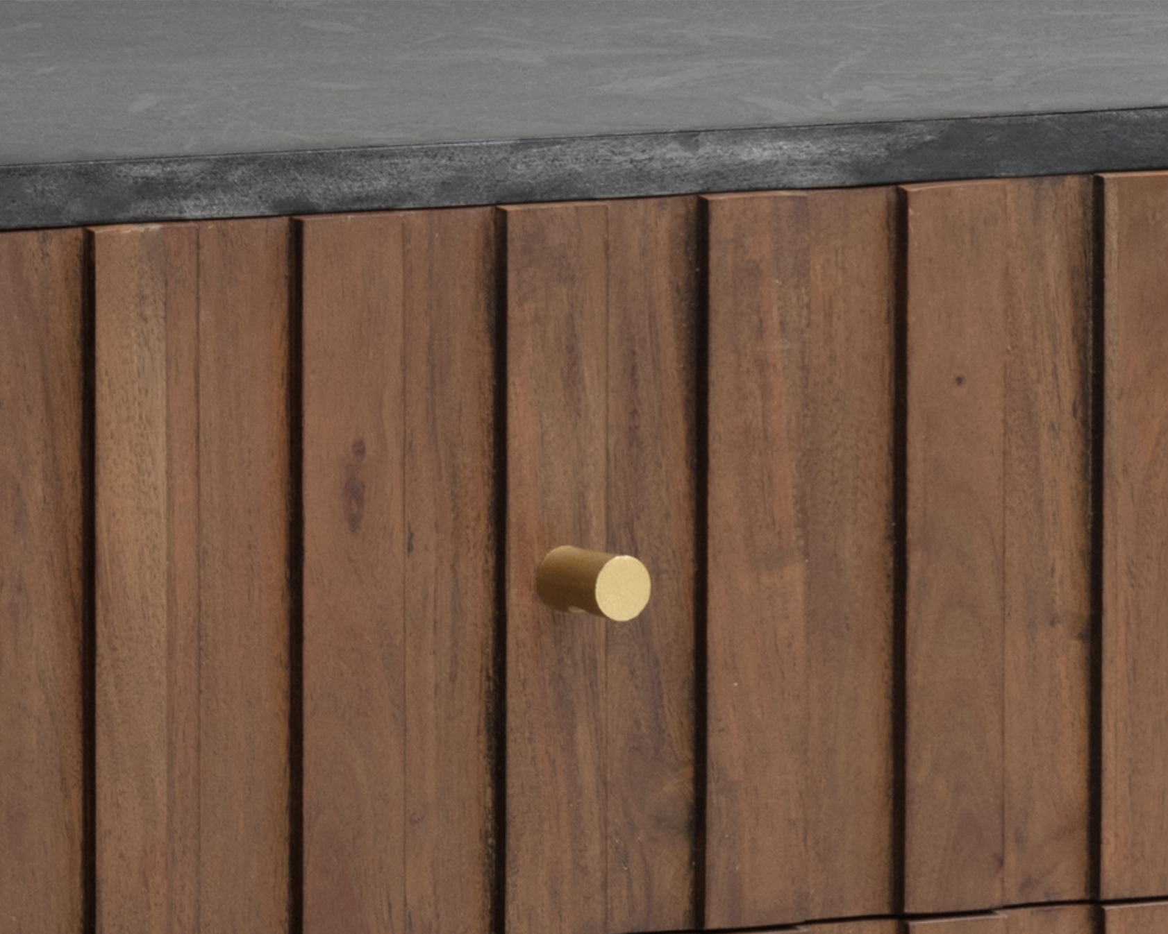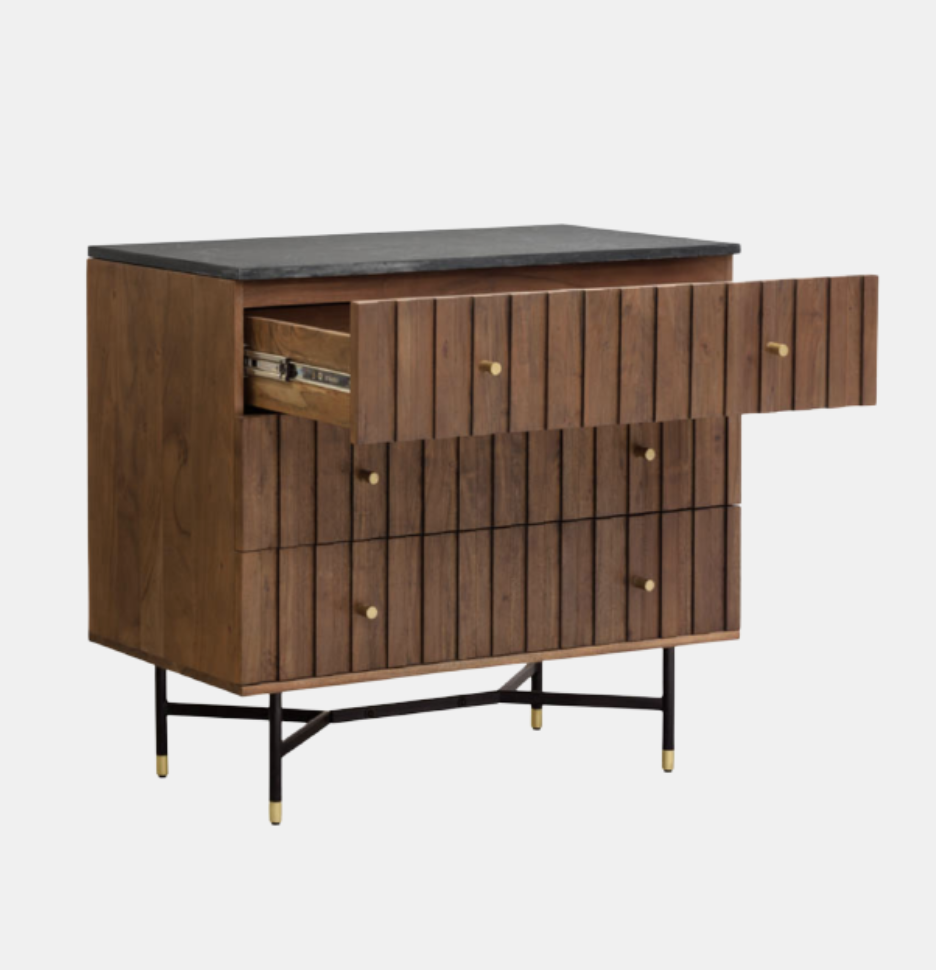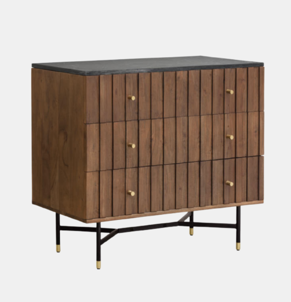 Marrying two rich materials with distinct textures, this chest evokes a design that is inspired by global travels. The Wellington chest is made with a brown solid acacia wood frame and features a black marble top. It includes three drawers, completed with a black iron base and brass metalware accents. Also available in white marble. By nature, these materials develop unique imperfections such as fissures, markings and colour variations for a truly one-of-a-kind piece.