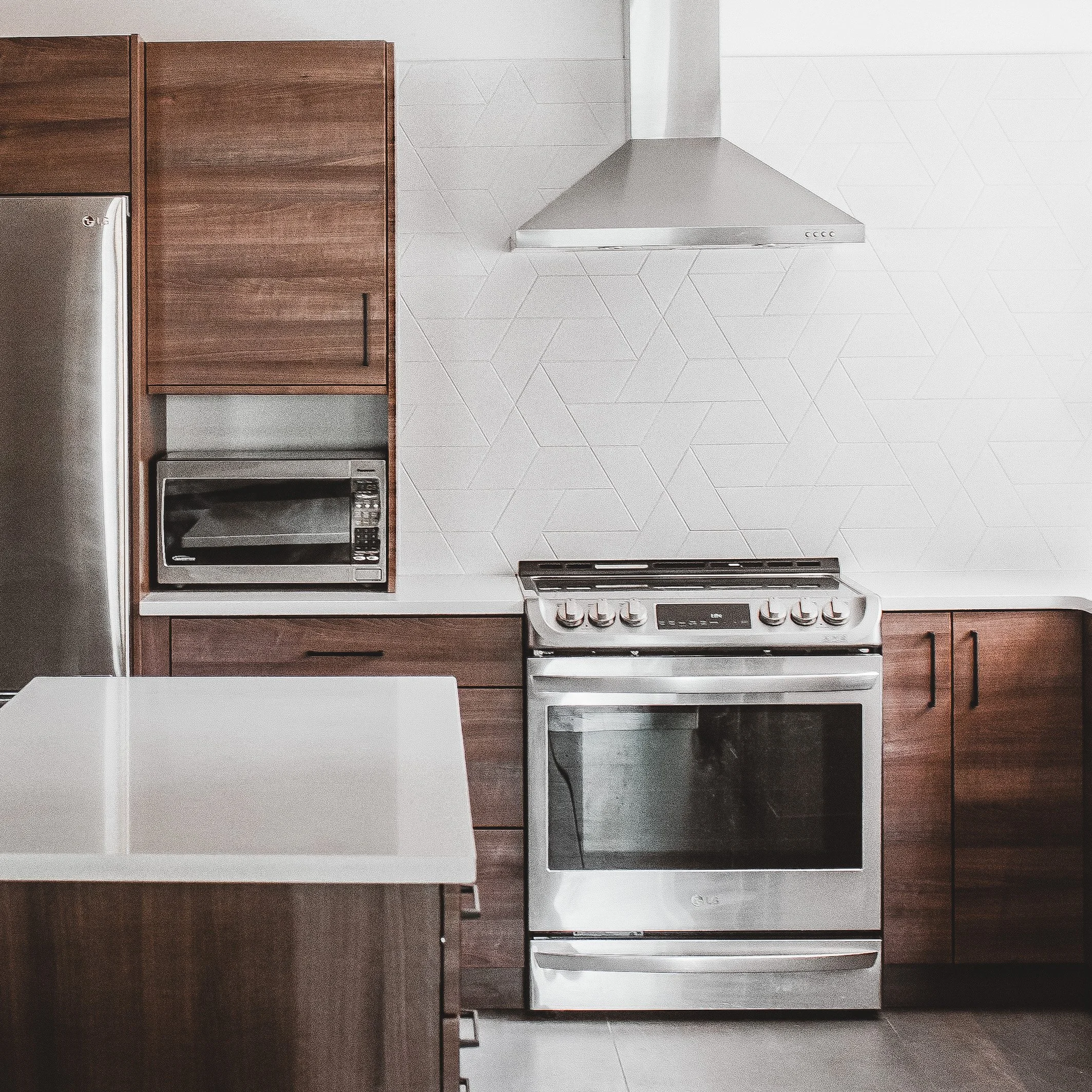 Part of what was critical to the clients was to work in an island and coffee bar to the existing footprint of the kitchen. We used warm wood tones to stay true to the mid century vibes and tied in some moody black millwork to modernize the design. We didn’t want to over complicate the finishes in the space so we went with white backslash tiles, but in a fun pattern to add something special!