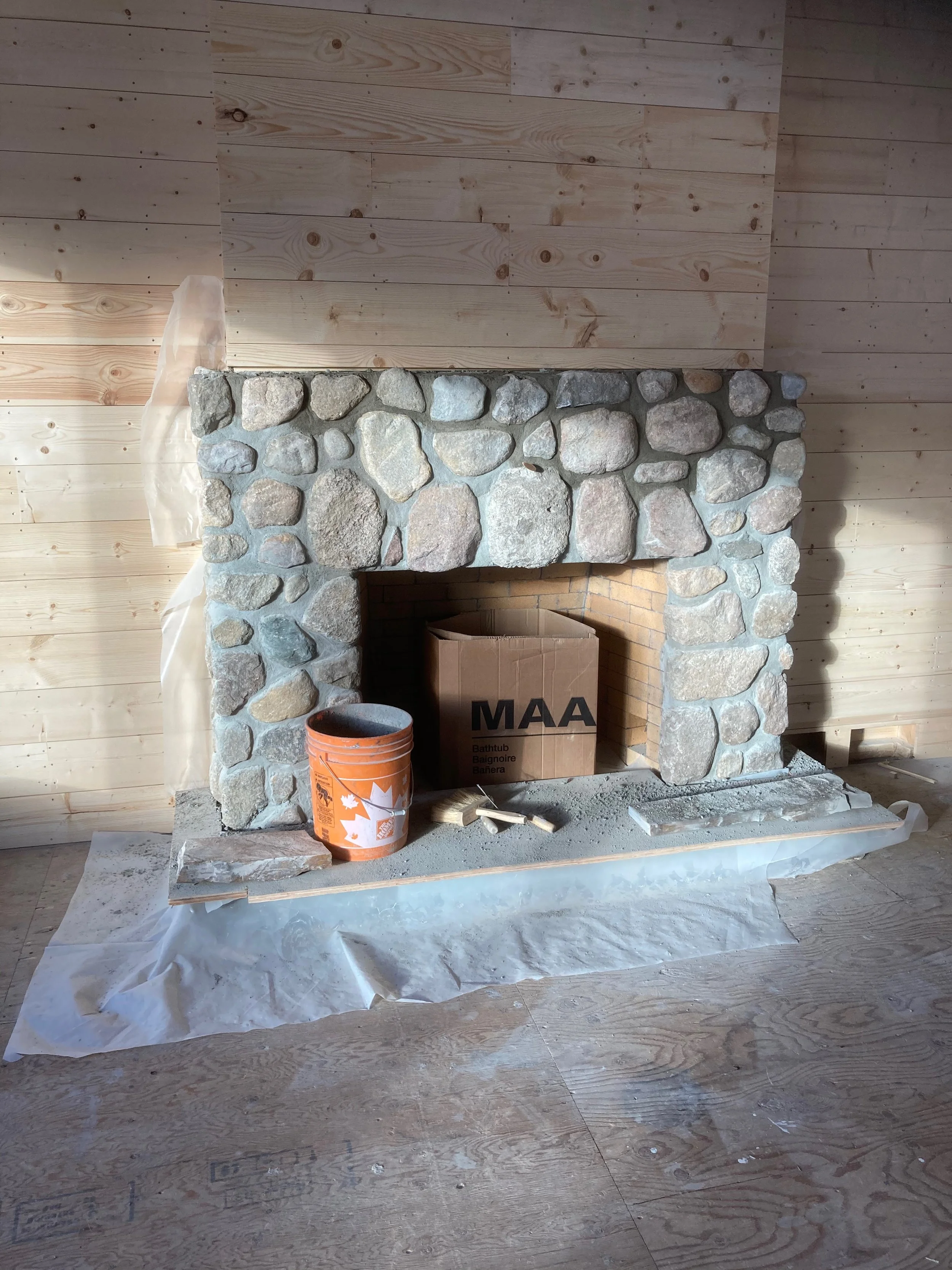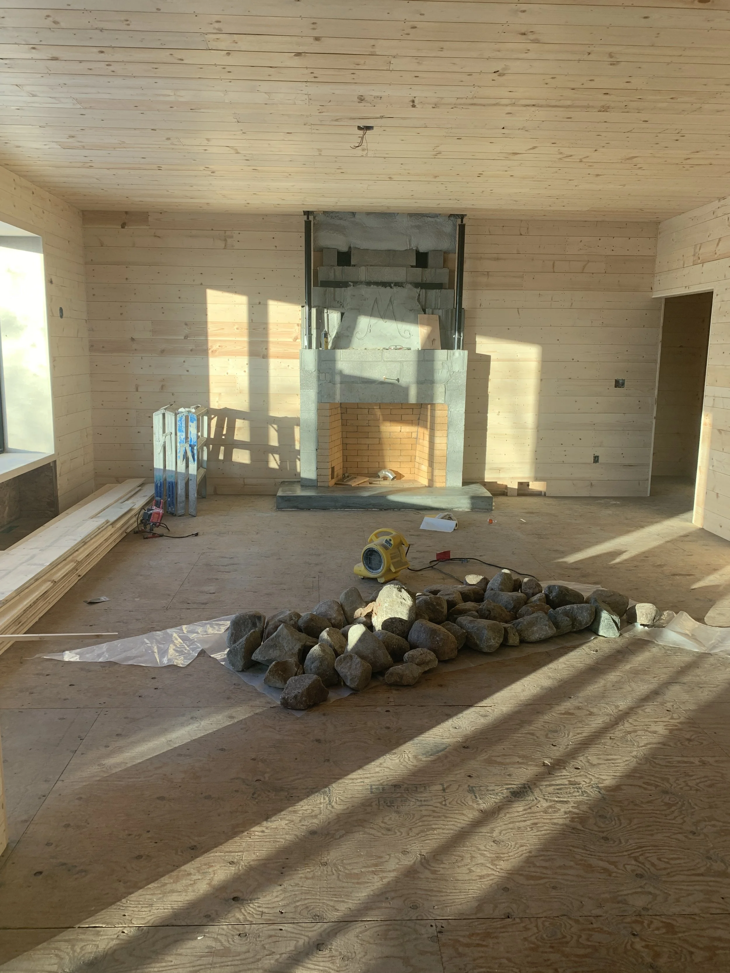 Back to the engineer we went to determine the new structure that needed to be added and to confirm what needed to be designed to make a masonry fireplace meet codes. Once all the technical stuff was sorted out we wanted to focus on the design, making sure to try and stay true to what was there. Part of why we loved it was because of the history, so to create something that was meaningful to the site, we used stones that were collected from the property to create the finished face of the new fireplace.