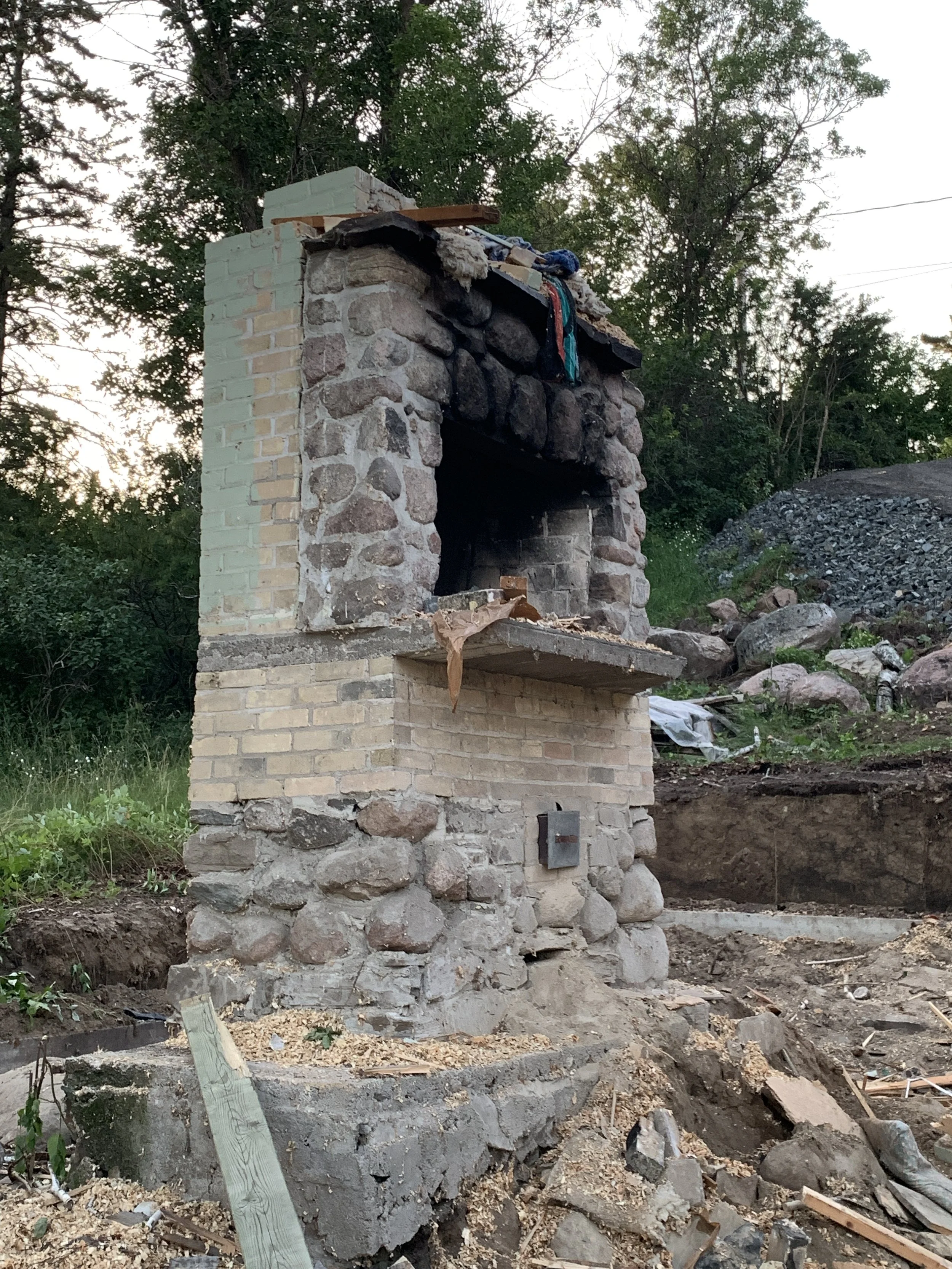 Masonry fireplaces are hand built on site, out of mortar materials such as concrete blocks, bricks, and stone and are part of the home's structural design. They carry a huge weight load and require a concrete foundation of their own. There are other types of fireplace inserts that can be used to incorporate a wood burning fireplace into a home, but there is no substitute for the charm and atmosphere created by an open fire which is why masonry fireplaces offer a fireside experience that is like no other. Because of all that, they also come with a hefty price tag! It’s one of those things that is either very important to the design of a space (therefore worth the investment) or something that isn’t necessary to create the desired atmosphere. I bet you can guess how we felt about how important it was to the design…. and so the rebuild began.