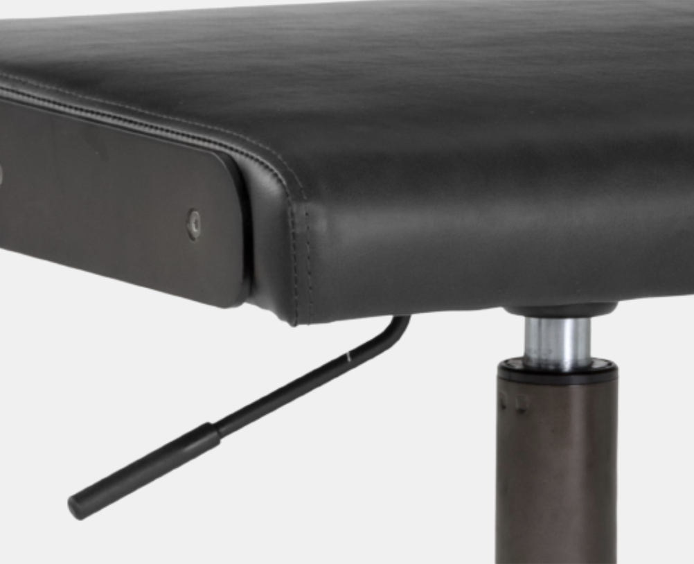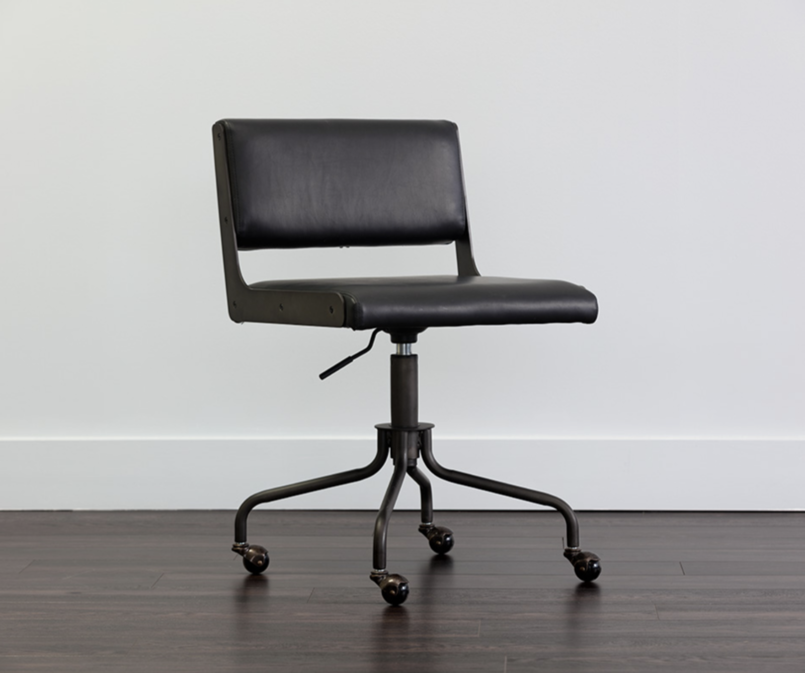 This armless office chair was inspired by Scandinavian style with an industrial flair. Stocked in rust tan and onyx faux leather and finished with an exposed brushed steel frame. Castors allow for easy mobility. Faux leather is manufactured to reflect the natural characteristics of leather; as such, colour variations, markings, wrinkles, grooves, and light scratches are appreciated characteristics. No two pieces will be alike.