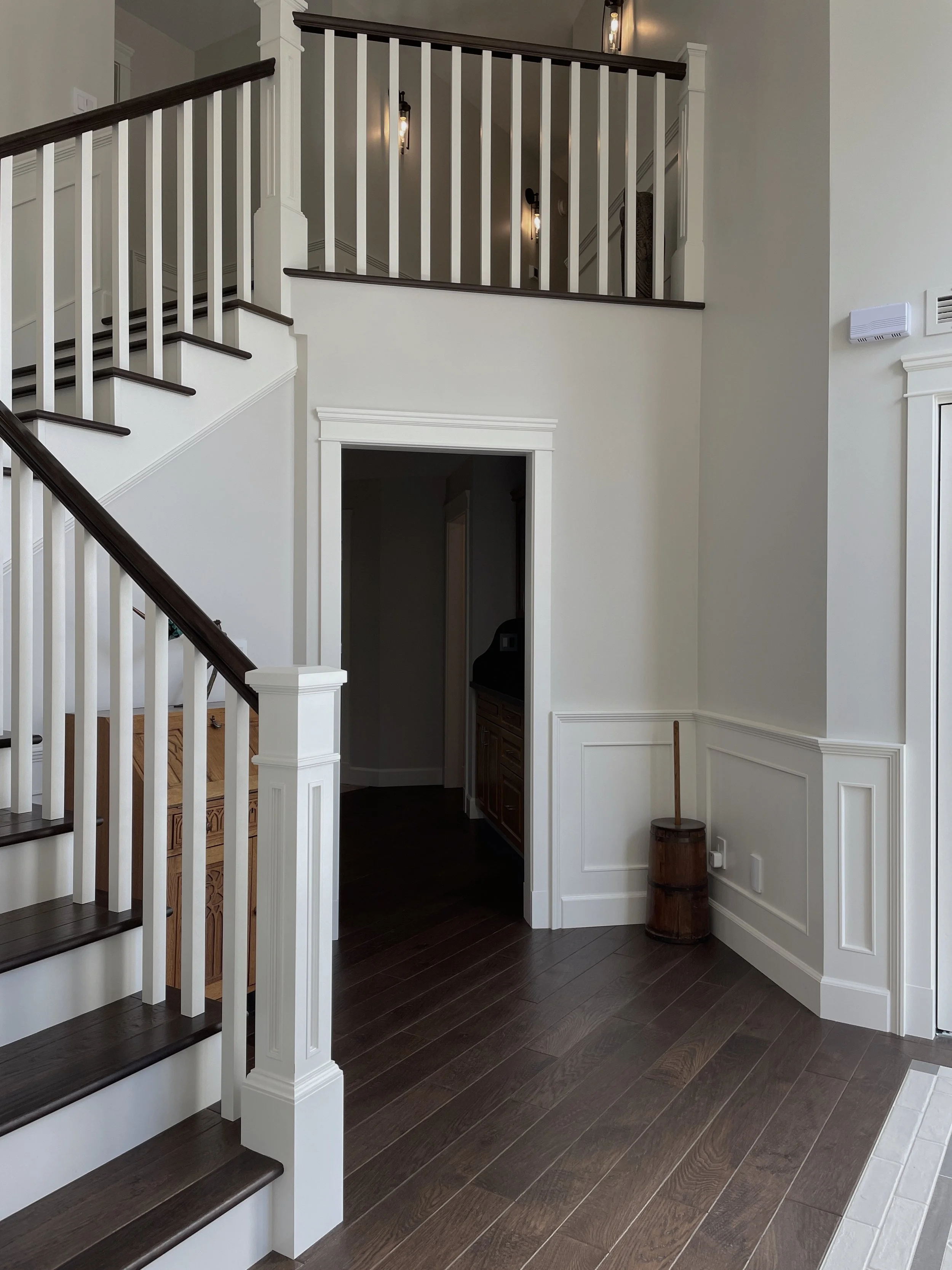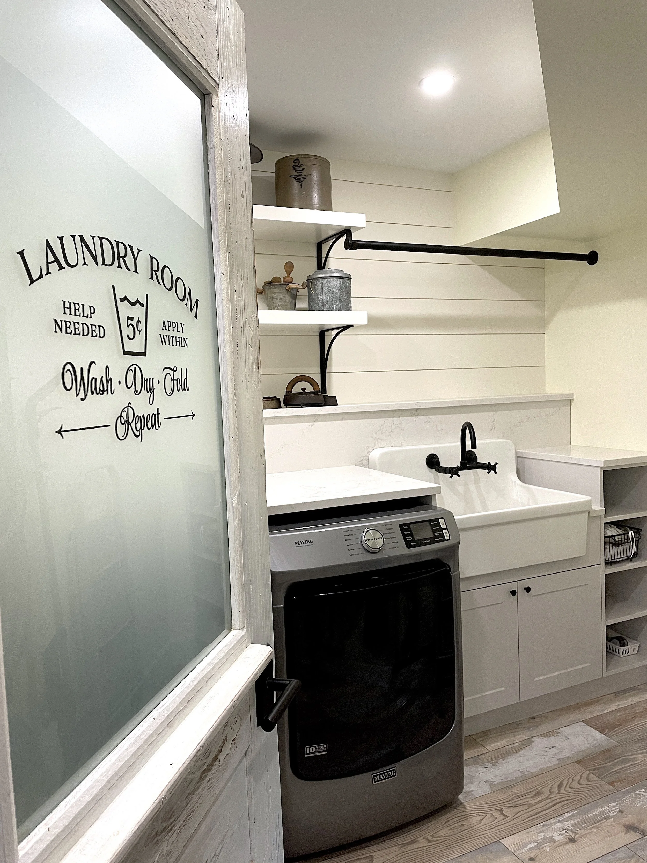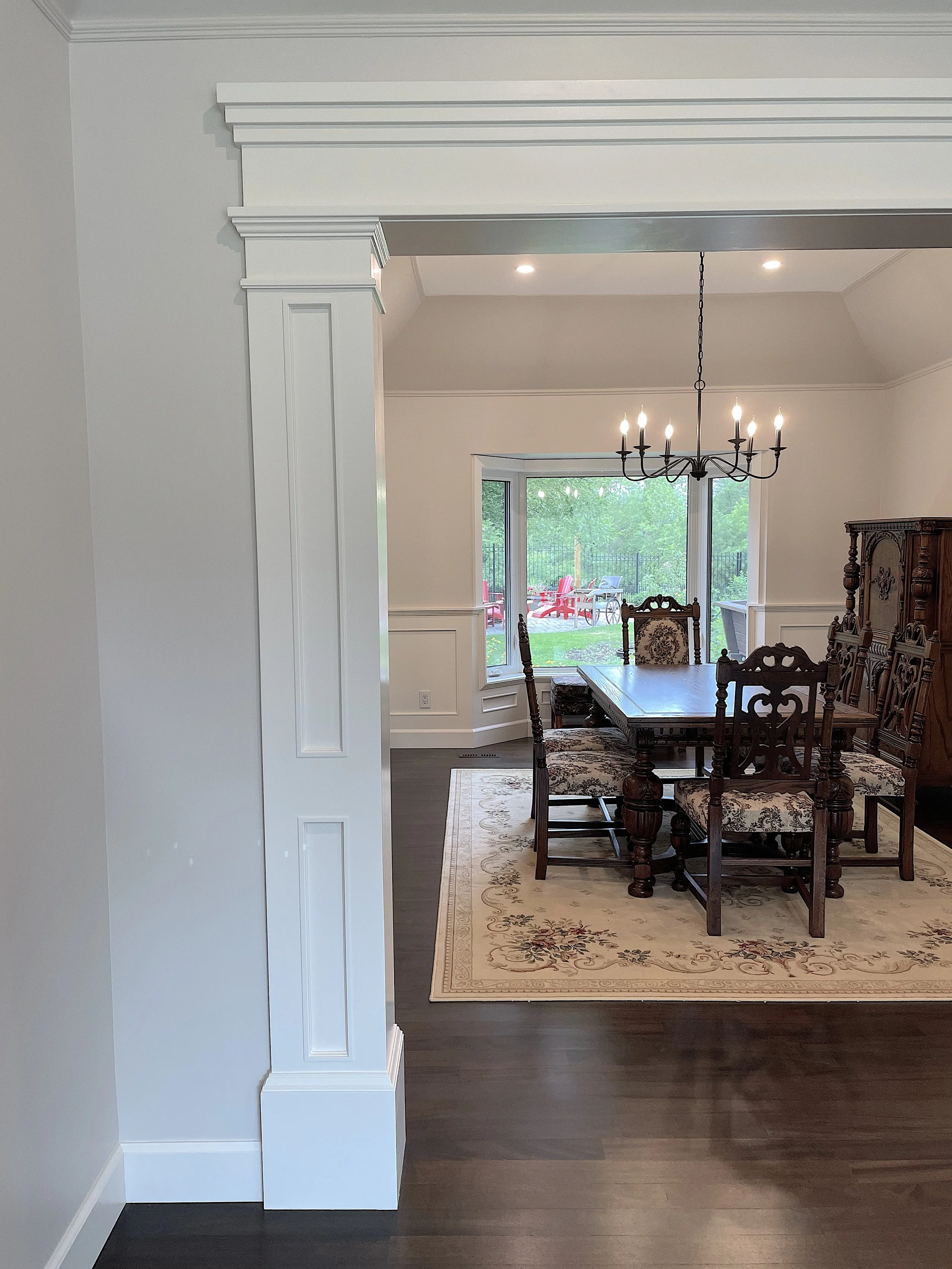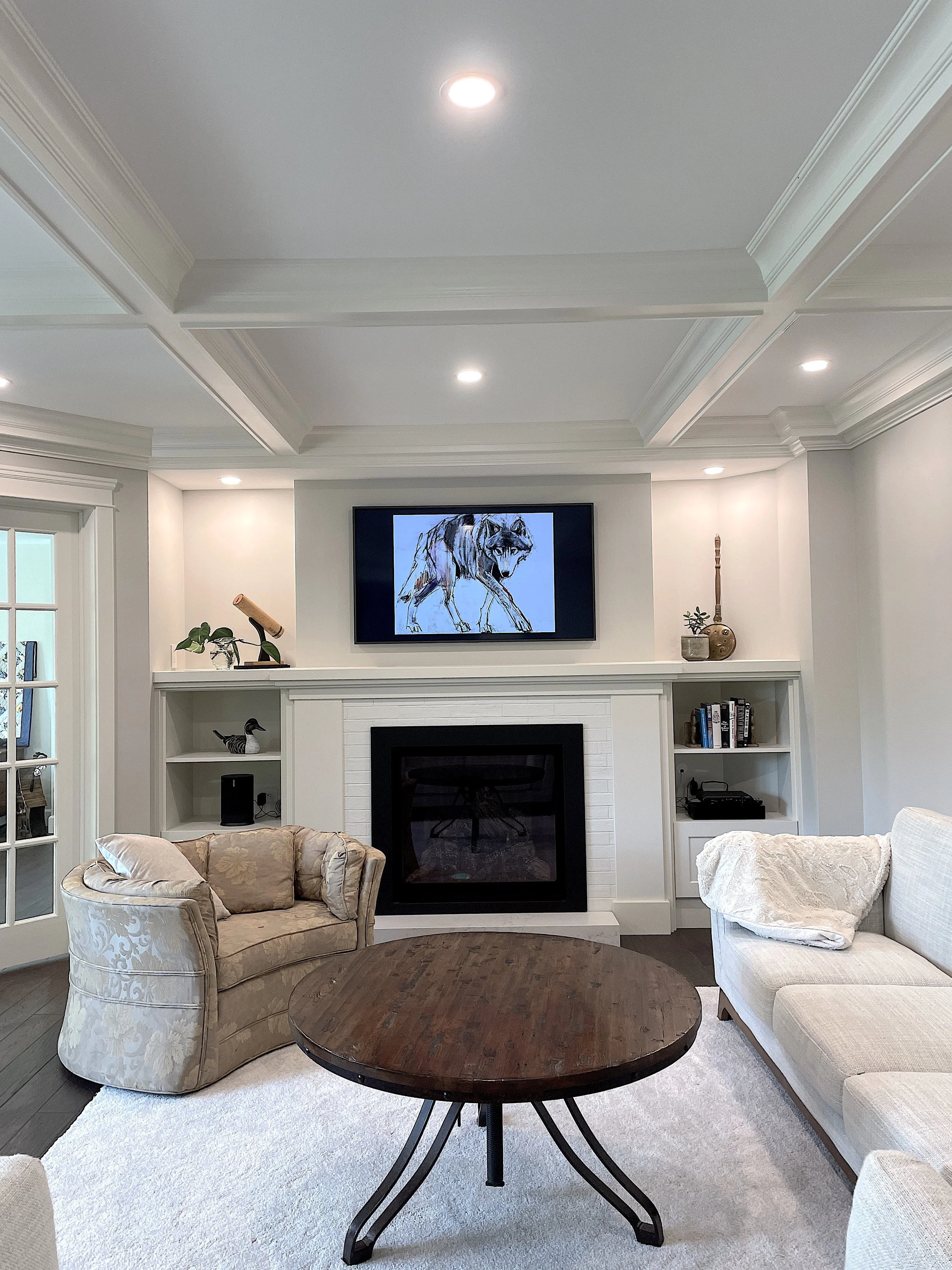 We took a 1980s house, oak trims and all, and turned it into a gorgeous modern colonial masterpiece! This design features detailed intricate mouldings, a coffered ceiling, stunning fireplace, custom mudroom millwork and the list goes on! We loved working with these clients because of their unique hands on approach that added some amazing, one of a kind details! They even built their own custom laundry room door etched with their initials in it! Talk about personal touches that completely make a space your own!