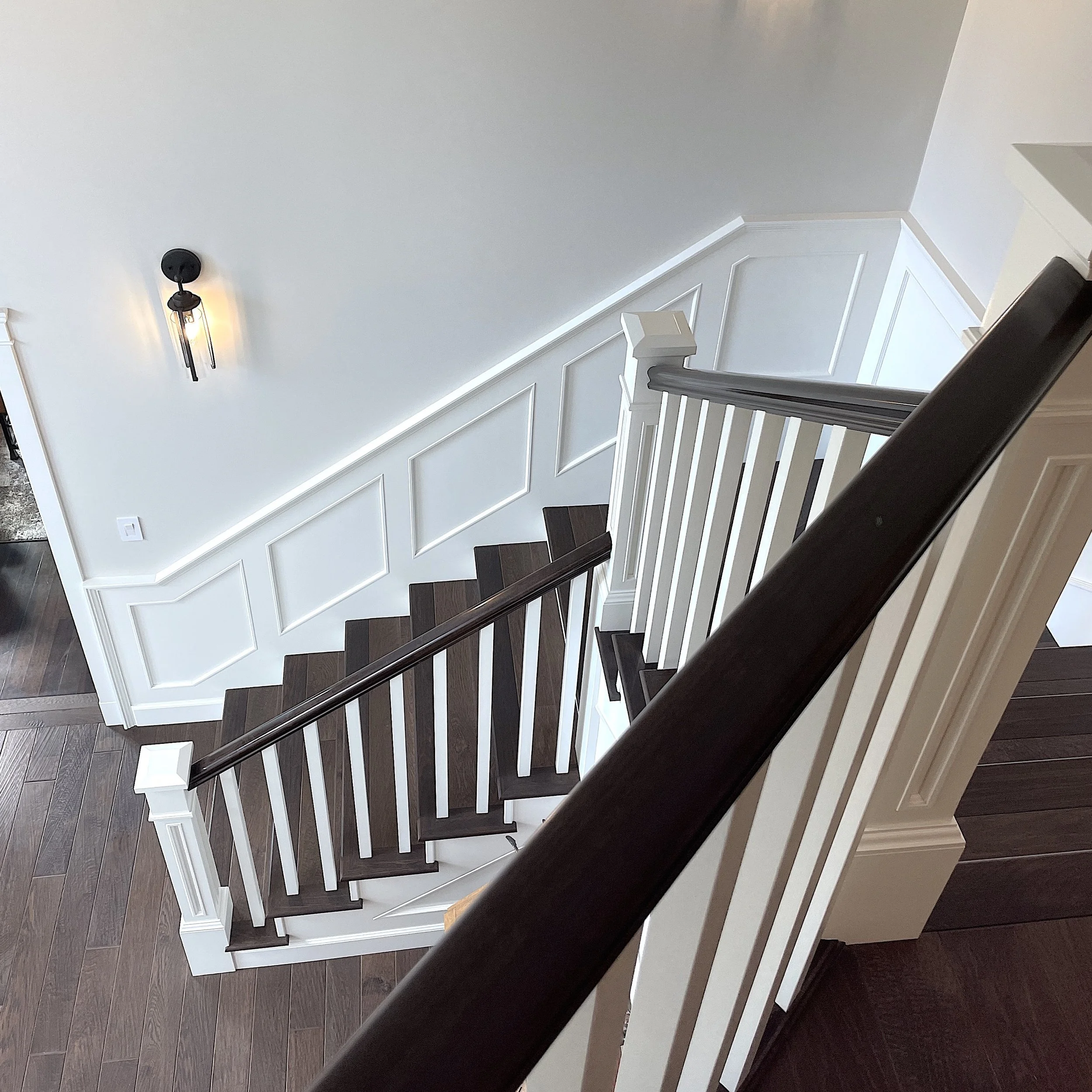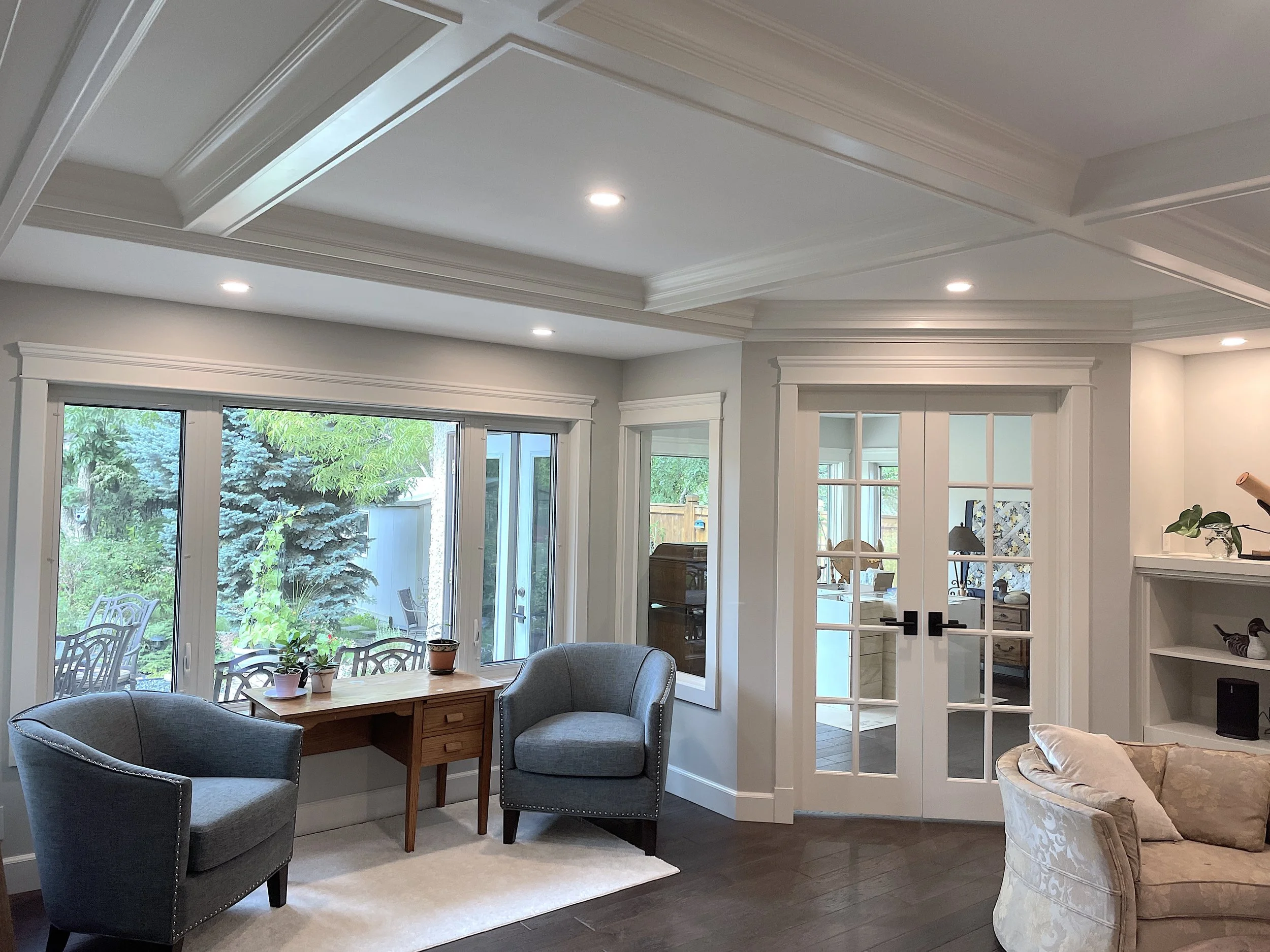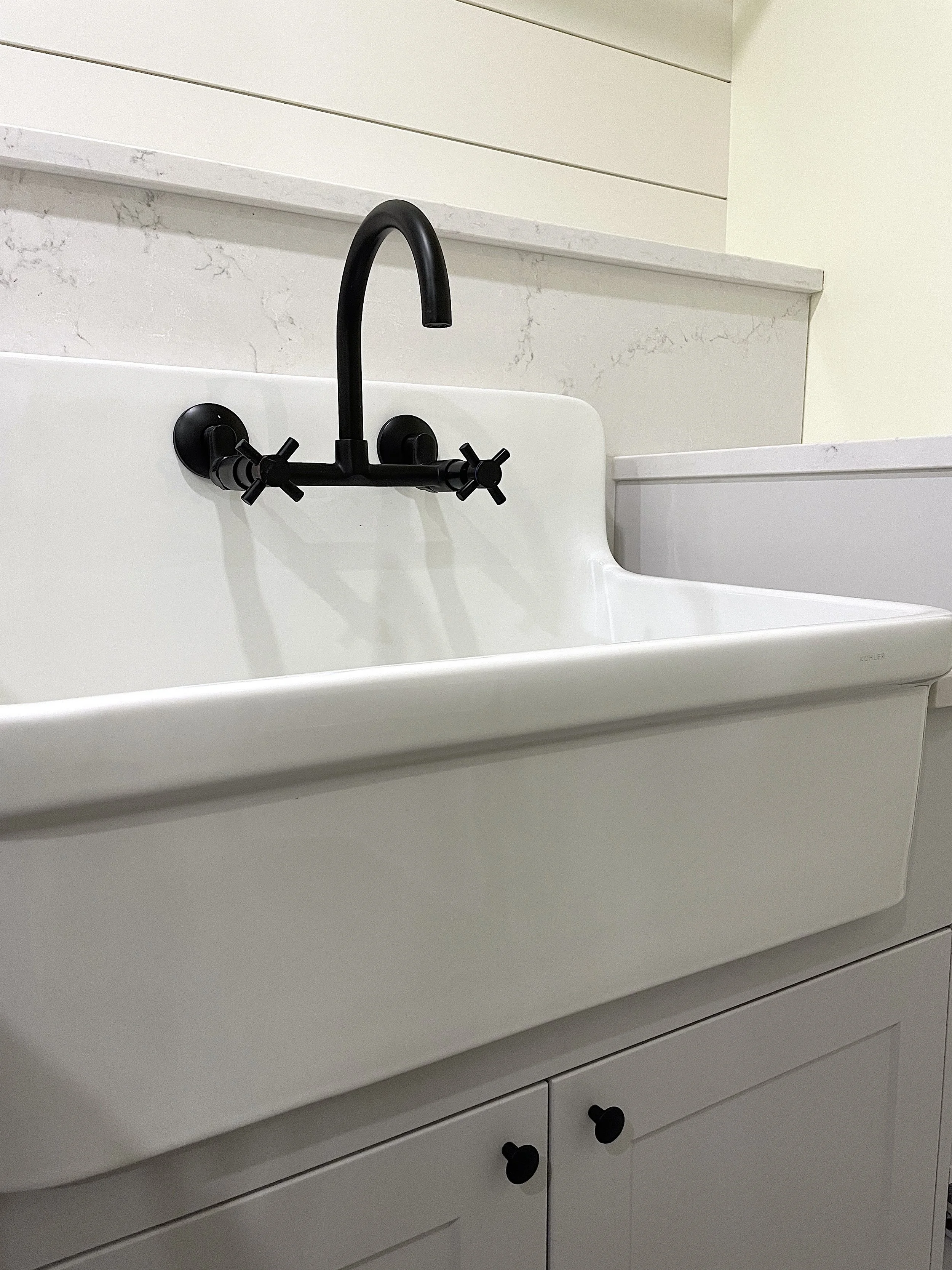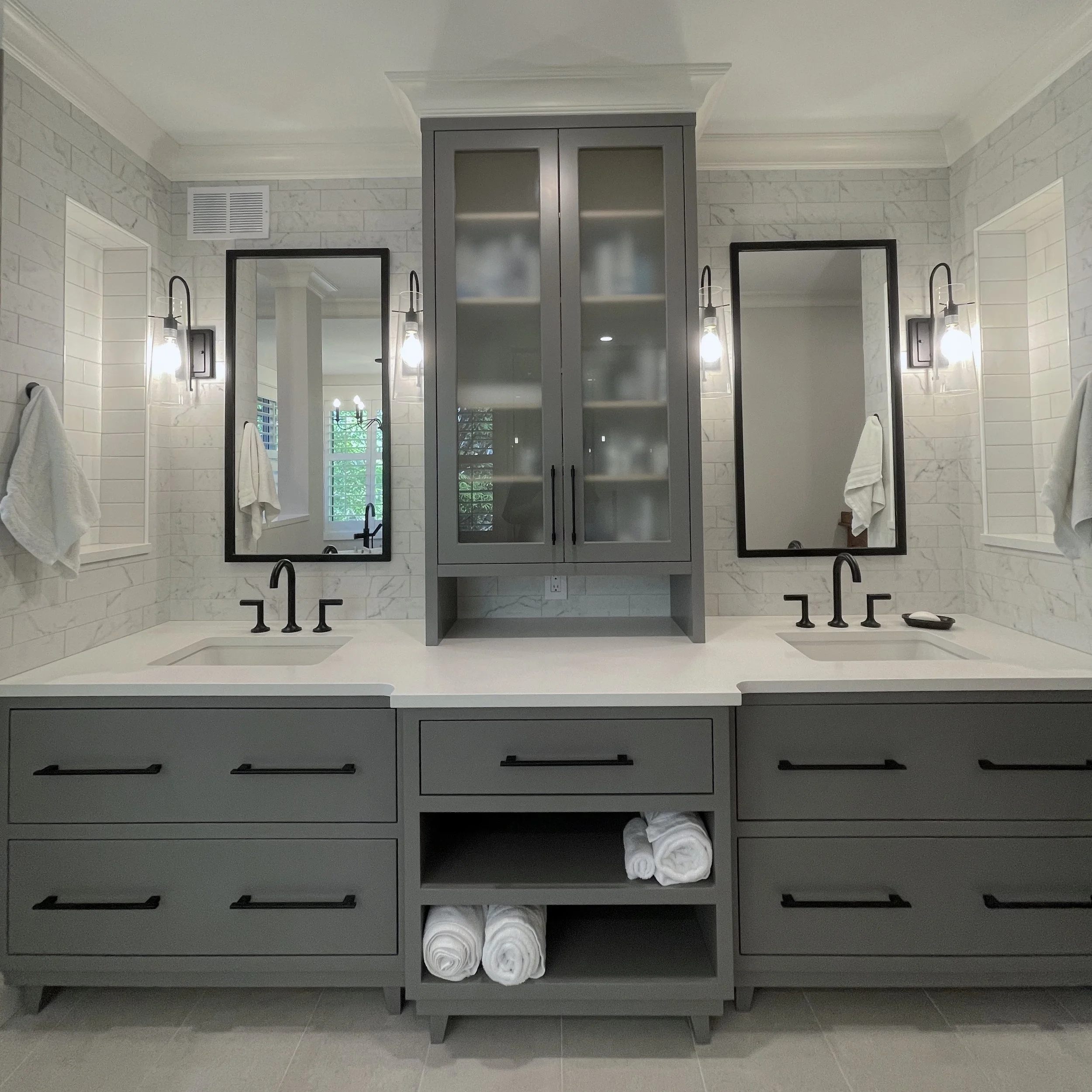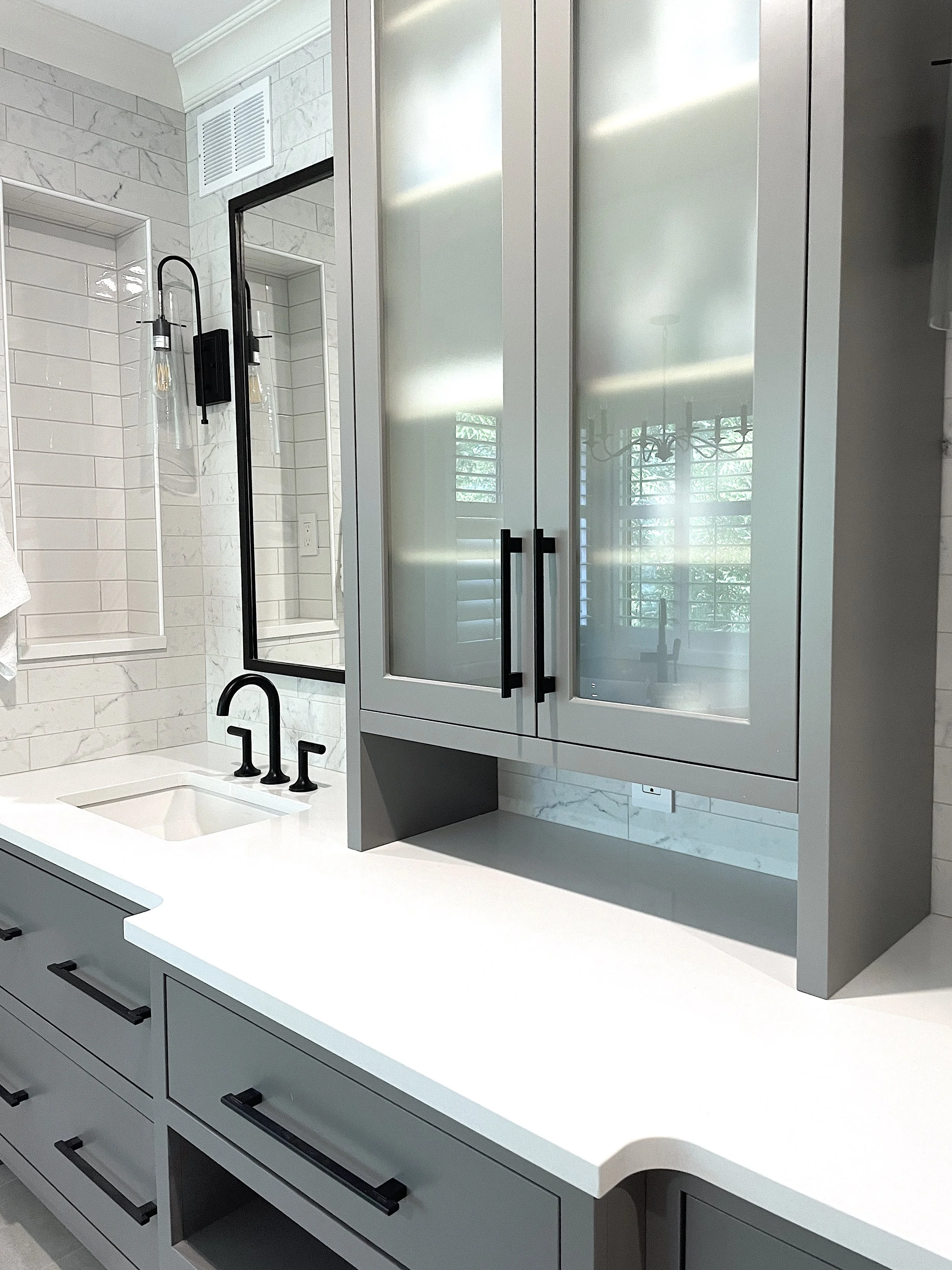 We took a 1980s house, oak trims and all, and turned it into a gorgeous modern colonial masterpiece! This design features detailed intricate mouldings, a coffered ceiling, stunning fireplace, custom mudroom millwork and the list goes on! We loved working with these clients because of their unique hands on approach that added some amazing, one of a kind details! They even built their own custom laundry room door etched with their initials in it! Talk about personal touches that completely make a space your own!