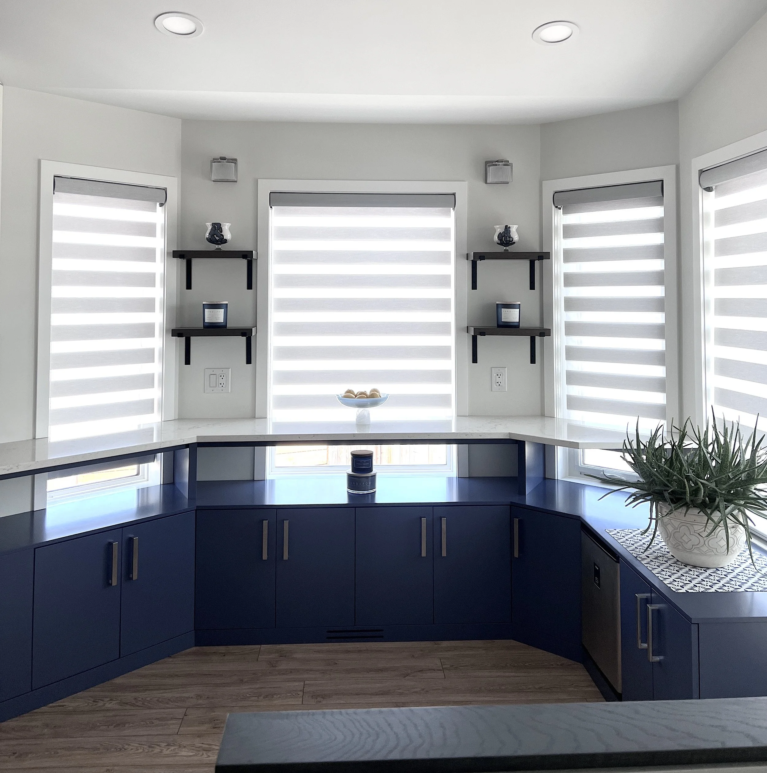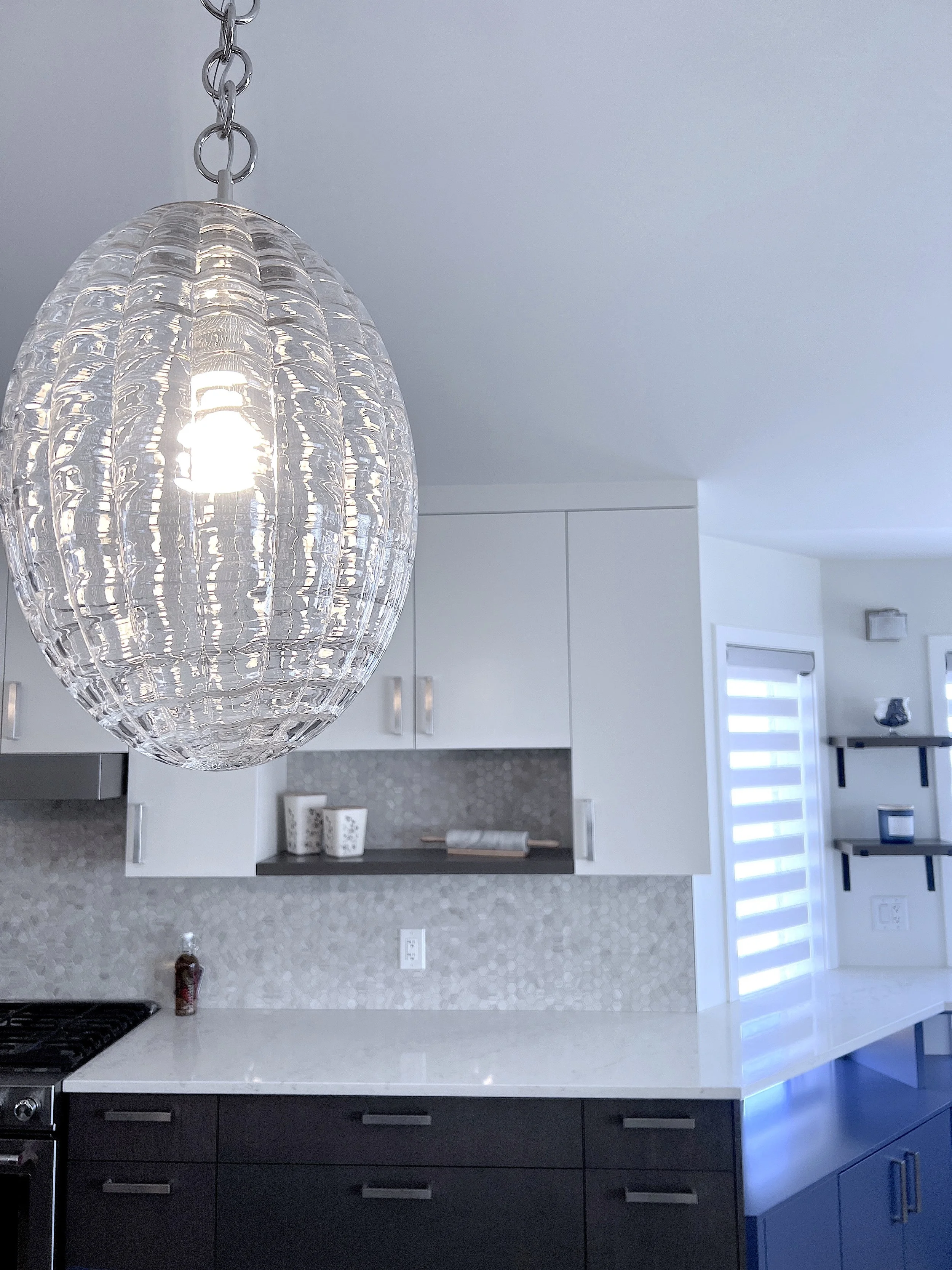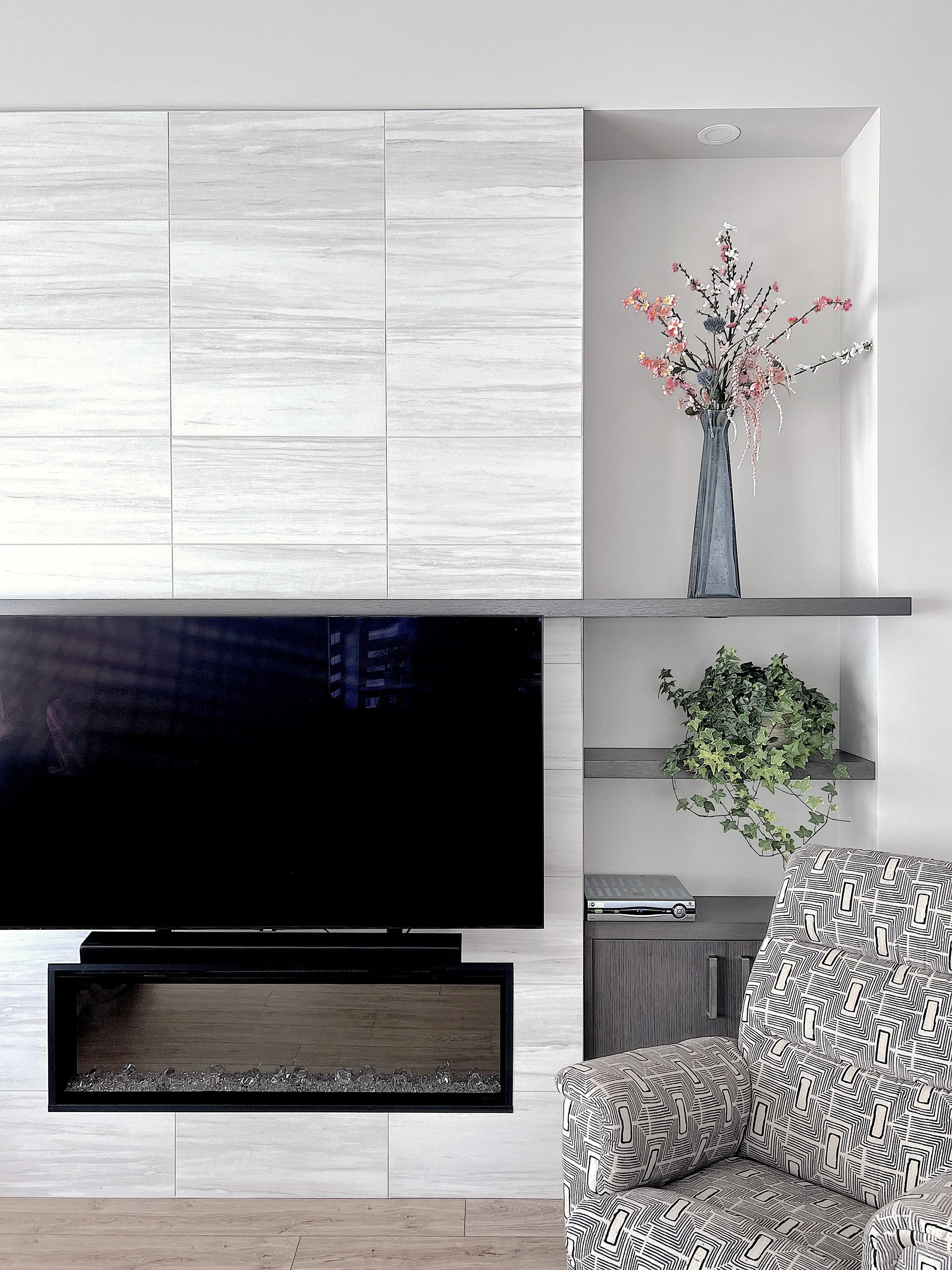 Who else would love a grande kitchen to entertain in? We made the kitchen the focal point of the whole main floor with a large 14’ island with integrated seating. This visually lengthened the open-concept main floor and made the space feel double the size! We also turned the existing window niche into a fun and functional bar area! The cherry on top was the fireplace update that really accentuated the vaulted ceilings. A true transformation without moving a thing!